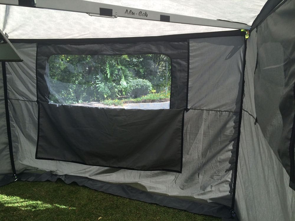 The Shadow Awning Side Wall Panels for Khaya Camper provide added privacy and weather protection. Includes windows, door, and extra legs for stability!